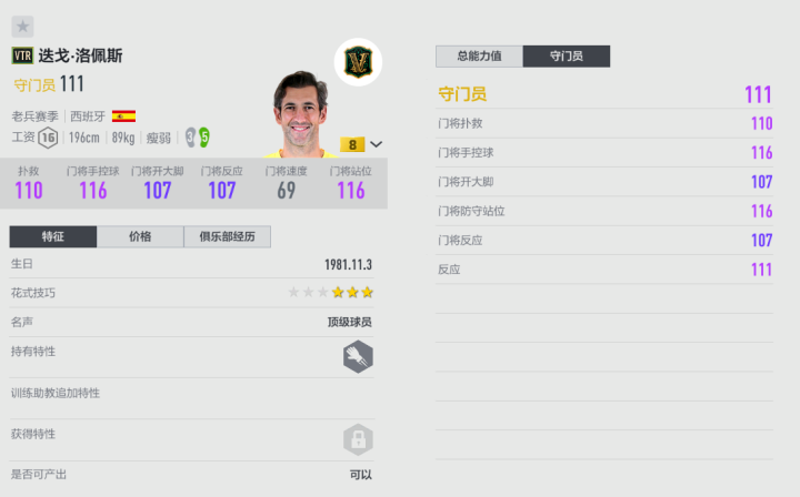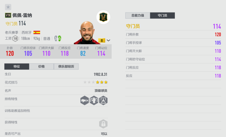 西班牙老将佩佩.雷纳征战赛场近20年,在英超、西甲、意甲和德甲等顶级联赛都留下过奋战的身影。雷纳曾随西班牙国家队夺得世界杯、欧洲杯等重大赛事的奖杯,俱乐部方面也收获颇多,可以说是“人生赢家”。游戏里雷纳的巅峰赛季是VTR,也是对这位赛场老兵职业生涯的最好总结。