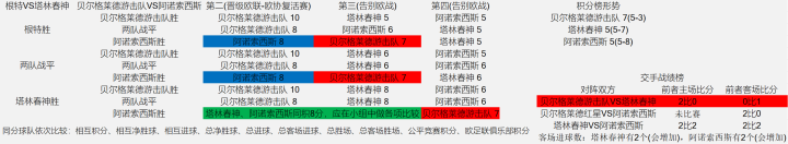 明晨1时45分,塔林春神客战根特,阿诺索西斯客战贝尔格莱德游击队。贝尔格莱德游击队主场2:0击败塔林春神,尽管客场0:1输球,但还是取得了战绩优势,两队同分时塔林春神在贝尔格莱德游击队之后;贝尔格莱德游击队此前客场2:0力克阿诺索西斯;塔林春神与阿诺索西斯两回合比分都是2:2,因此要在小组中做各项比较。晋级形势尽在这张表里: