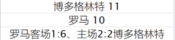 罗马在与博多格林特的两回合较量中仅录得1平1负,其中在挪威1:6惨败更是成了"耻辱"。两个赛季前,博多格林特就曾在欧联资格赛中给AC米兰制造过麻烦。穆里尼奥的罗马显然是轻敌了,因此,罗马目前还落后于博多格林特一分排在第二。上一轮之后,本组其它两支球队宣告出局。