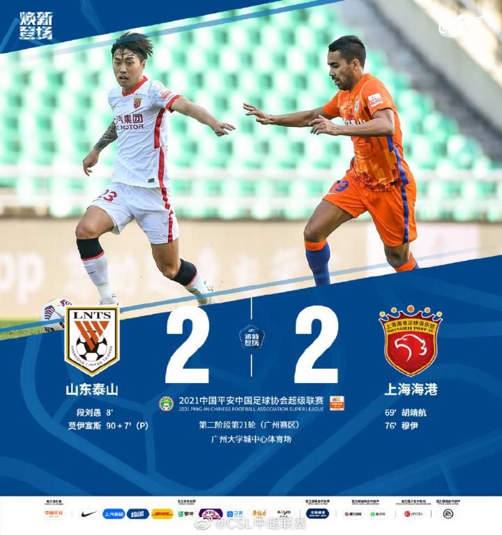 丢球之后,心有不甘的山东泰山主教练郝伟,也立即安排郭田雨、金敬道替补登场,加强攻防。然而,由于是被动换人,所以,泰山队很难再次掌握主动权。第75分钟,随着穆伊包抄破门,上海海港2-1反超了比分。好在补时阶段,莫伊塞斯依靠单刀赢得点球,并亲自主罚命中。这样,凭借这个绝平进球,两队最终2-2平分秋色。