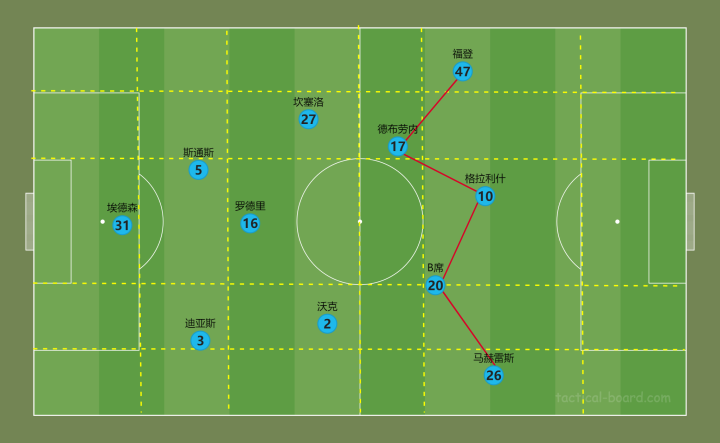 通过英超第17轮7:0利兹联的比赛中我们可以看到,在比赛第七分钟时,罗德里作为单后腰在中场给出了一脚非常完美的传球。尽管当场比赛瓜迪奥拉因为坎塞洛与门迪无法上场被迫派出了3中卫的体系,但在前场依然可以很清晰的看到前场三人组的不断换位。在进攻时,作为伪9在中间的则是47号福登,而在左右两边则是中前卫B席与德布劳内这样中前卫进行前插做文章打身后的场面在曼城的比赛中并不少见。而由于扩宽两条边路的则是格拉利什与马赫雷斯,尽管贝尔萨作为同是作为内收边卫与列位式的大师级教练,瓜迪奥拉依然利用了对方防线没有及时落位与缺乏人数优势这一点造成了巨大的威胁。