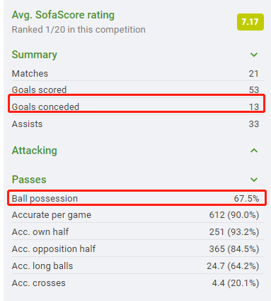 对于列位式的防守,瓜迪奥拉依然做到了近乎于极致的完美。联赛刚刚过半20轮联赛全英超丢球与进球均为最佳,13粒的丢球无疑是对这支队伍最大的肯定。尽管曼城拥有全欧最顶级也是最豪华的后防天团,但好马也要配好鞍足球世界更是如此。而曼城联赛整体控球率也达到了惊人场均67.5%。