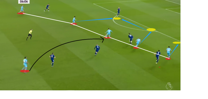 由下图我们可以很清晰地看到,当两名边后卫内收至中场时,球队整体阵型看起来更像是2-3-5,而中场则是继续保持者3名球员。而两名中前卫则会向前参与到前场的进攻中形成5名进攻球员的进攻群组。在常规情况下,由于中卫内收可以很好地提供向前的纵向传球,而且由于我方中场依然有两名中前卫一部分也会吸引对方的球员进行盯防,此时我方前场就会出现人数上的优势。