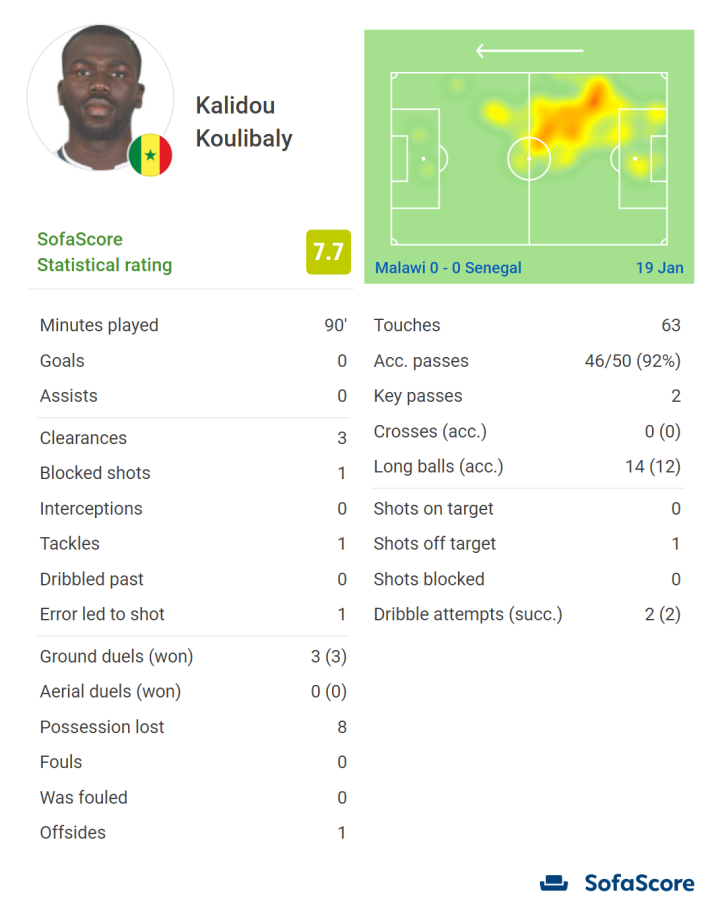 塞内加尔的卡利都·库利巴利在防守端贡献3次解围、1次抢断、1次阻挡射门。他在3次地面球争抢中全部胜出。传球成功率为92%(50传46准),成功发动12次传球,送出2次关键传球,还有2次成功过人。他的表现帮助塞内加尔零封马拉维,保住了小组头名。