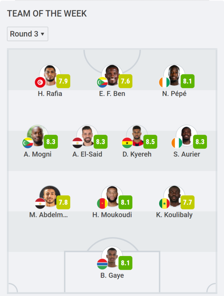 北京时间2022年1月21号,2021喀麦隆非洲杯小组赛最后一轮的比赛全部结束,晋级淘汰赛的16支球队就此产生。著名数据评分软件SofaScore评选出了非洲杯小组赛第三轮的最佳阵容。其中,有一人是二度上榜,科摩罗、科特迪瓦、埃及都有两人在列,3人来自E组球队,4人来自五大联赛。