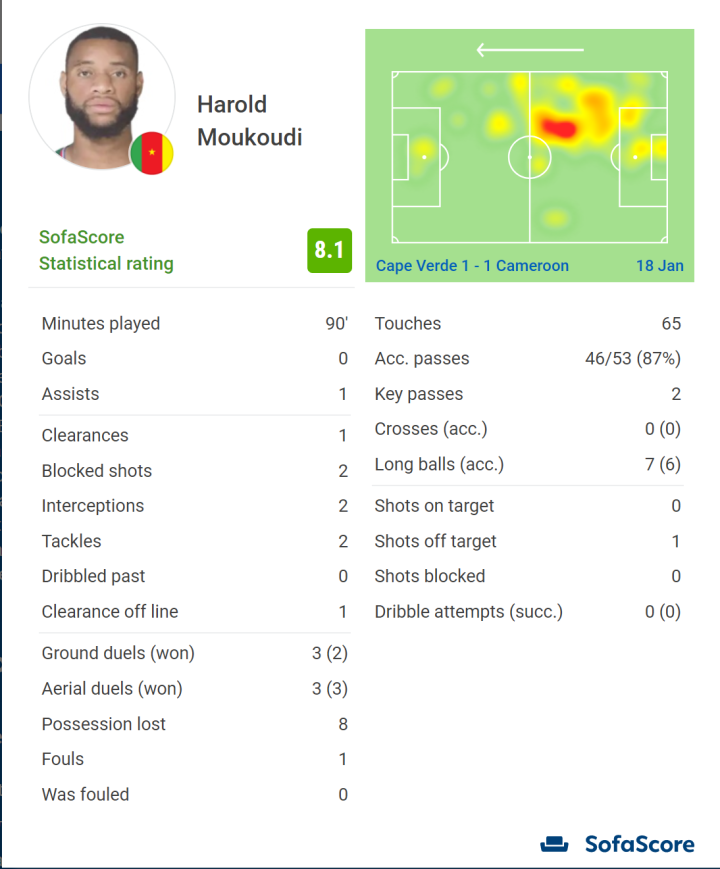 喀麦隆阵中的穆库迪也入选了。他在与佛得角一役中,为阿布巴卡尔送上助攻,帮助东道主保住小组头名。在防守端贡献卓著,1次解围、2次拦截、2次抢断、2次阻挡射门,地面球和空中球争抢共6次成功5次。全场共65次触球,传球成功率87%(53传46准),策动6次长传,送出2次关键传球。