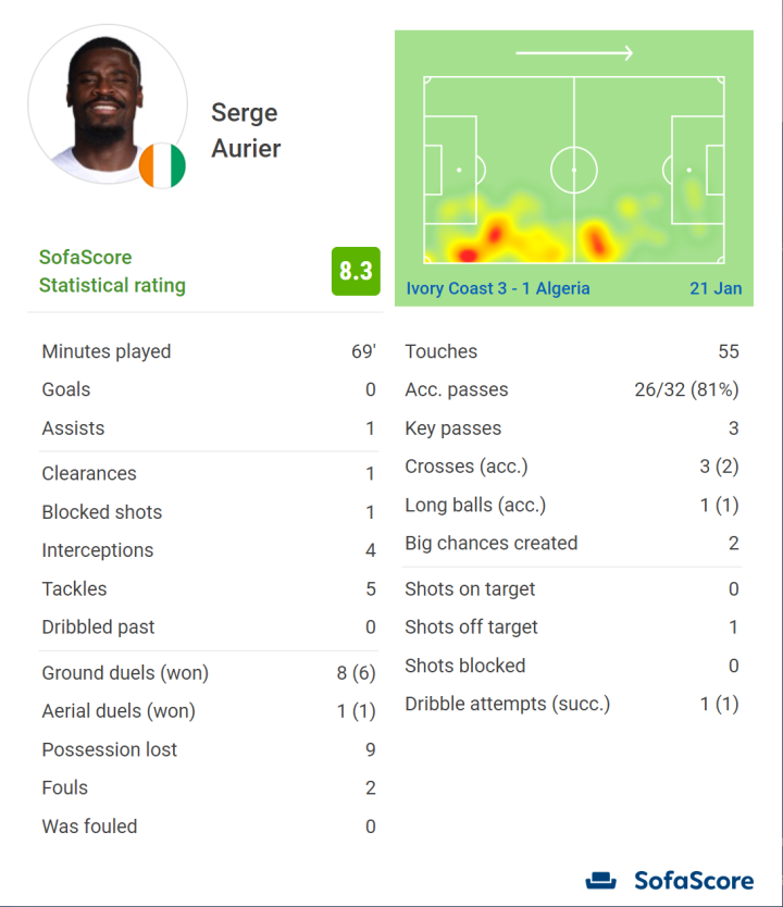 科特迪瓦的奥里耶作为右边中场入选。与阿尔及利亚的关键出线战,他为伊布拉希姆·桑加雷送上助攻,助后者头球破门扩大优势。奥里耶本场攻防兼备,1次解围、4次拦截、5次抢断、1次阻挡射门,8次地面球争抢成功6次,有效保障非洲大象的后防线。在进攻端,他的传球成功率为81%(32传26准),送出3次关键传球,创造了2次绝对得分机会。