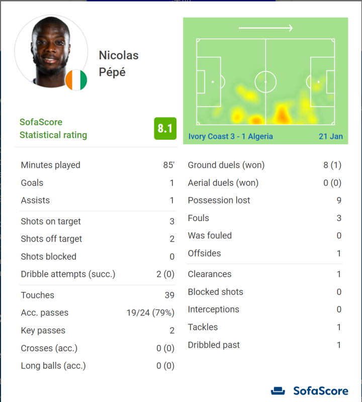 科特迪瓦的尼古拉斯·佩佩在与阿尔及利亚一战中先是助攻欧冠射手王破门,随后自己也取得进球。本场他极为活跃,5次射门3次射正,送出2次关键传球,24次传球19次成功(成功率79%).防守端还贡献了1次解围和1次抢断。