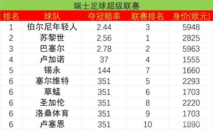 瑞士超最新夺冠赔率:伯尔尼年轻人第一,草蜢第六 ...
