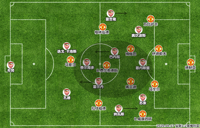 (图)2019/20赛季欧联杯半决赛,塞维利亚技术性击倒曼联。拖后中场费尔南多的视野和摆脱能力一般,洛佩特吉安排霍尔丹和巴内加回撤拿球化解对手的压迫,此举成为制胜的关键。