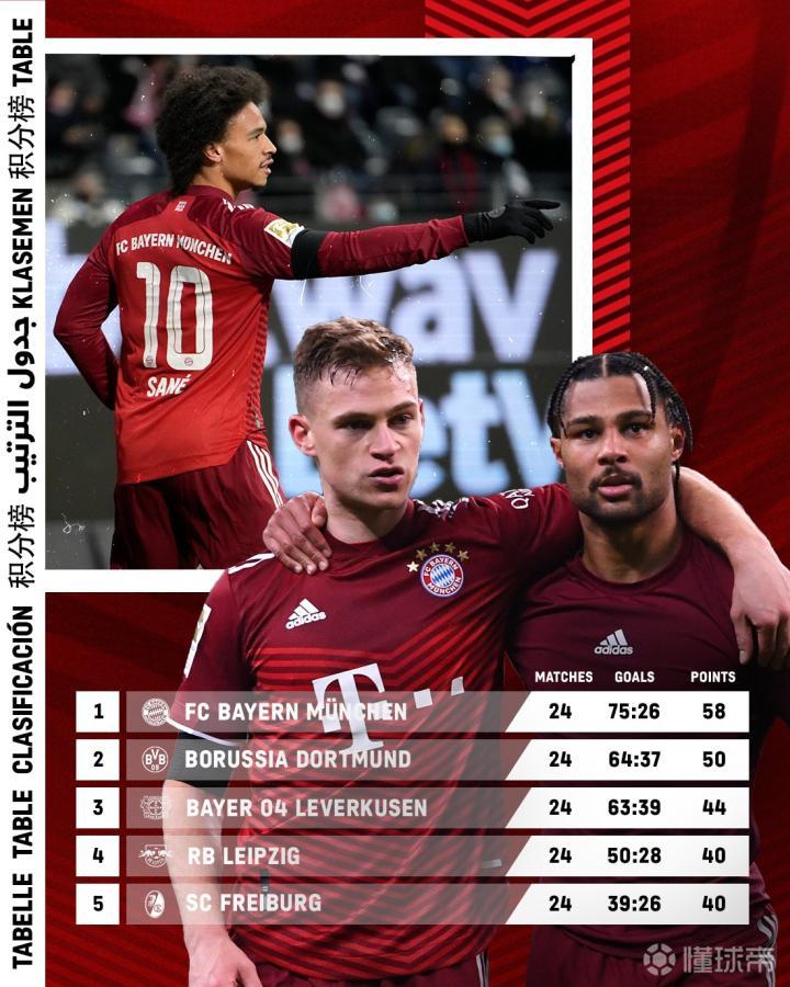 德甲最新积分榜,拜仁8分领跑,多特被奥格斯堡逼平...