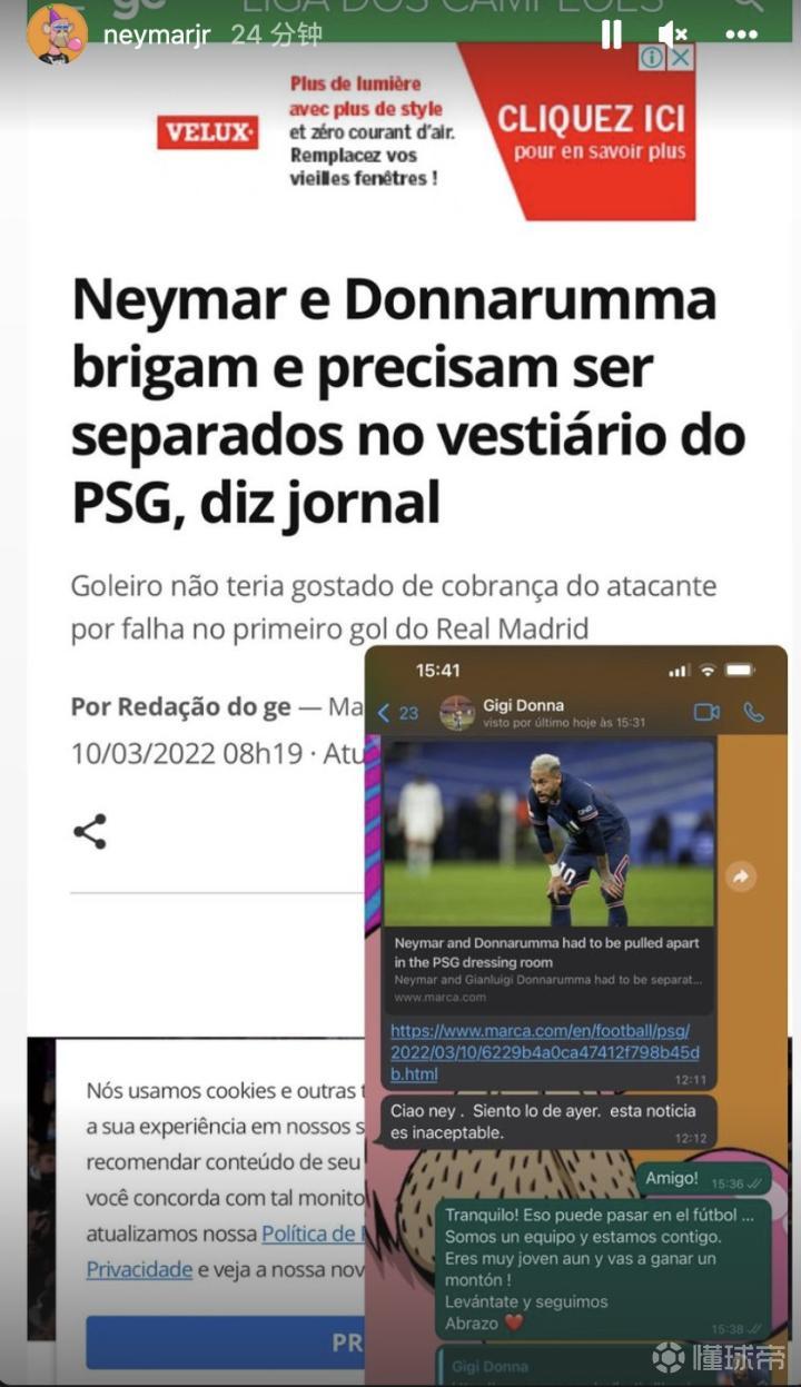 【内马尔晒与多纳鲁马聊天记录,并发文抨击关于争吵的不实报道】