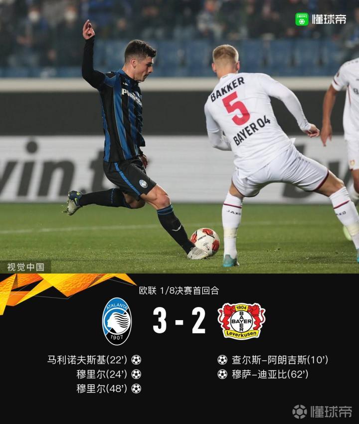 【亚特兰大3-2勒沃库森,穆里尔双响,阿朗吉斯、迪亚比破门】