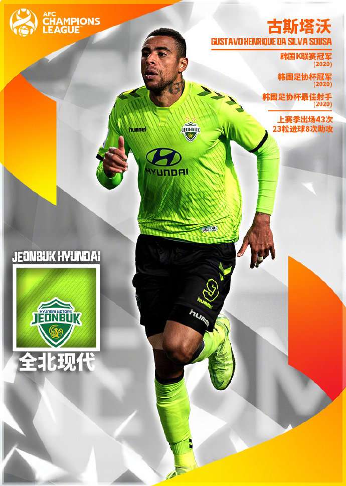 亚冠2022【球星之约|古斯塔沃】 2020年加盟全北现代的古斯塔沃很快融入了球队,并在当赛季帮助球队取得K联赛和足协杯双冠王。 2021赛季他又在亚冠赛场上证明了自己,8场奉献8球3助攻,在射手榜上位居第二。 本赛季全北现代与横滨水手、嘉莱黄英、悉尼FC共处H组,这位巴西强力前锋又将带来什么演的精彩表现?