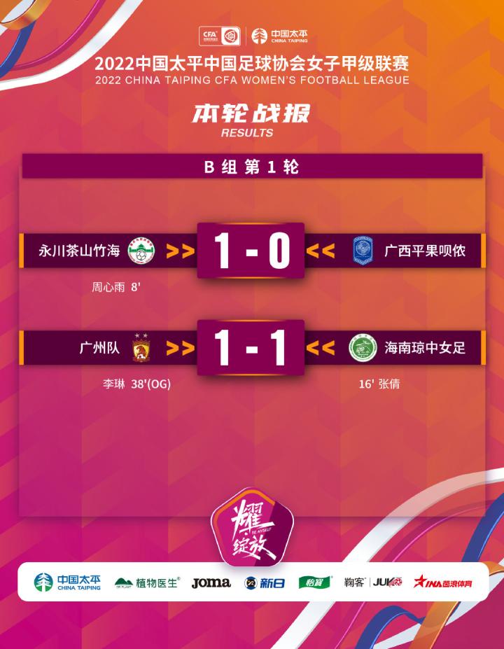下半场,永川茶山竹海用前锋许正花换下陈欣继续加强进攻,广西平果呗侬无奈用段小娟换下了受伤的梁玲娟。永川队继续控制比赛节奏,周心雨打中立柱,不断依靠传切配合制造机会;广西队用任意球制造机会,王新阳、张凯微的进攻有一定威胁。下半场广西姑娘没有让对手扩大比分,最终广西平果呗侬0-1不敌永川茶山竹海,另外一场比赛广州队和海南琼中女足打成1-1。