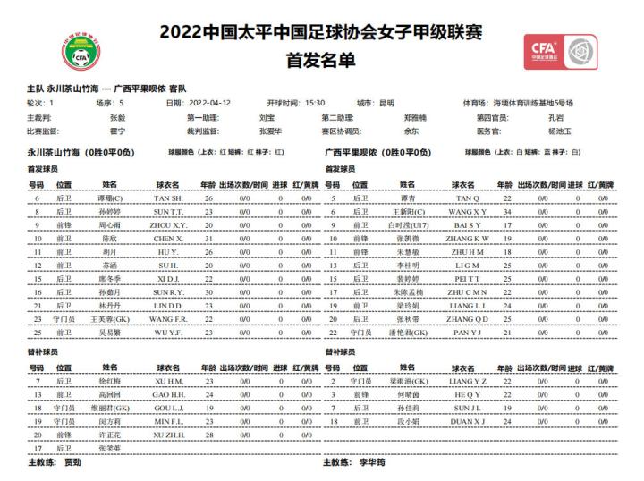 双方首发方面,永川茶山竹海队长6号谭姗、10号周欣、12号苏涵等核心球员悉数上阵,广西平果呗侬则派出442阵型,队长王新阳搭档李桂明打双后腰,柳州妹朱慧敏和武汉尖刀张凯微顶在锋线上,广西队首发派出了朱慧敏、梁玲娟、白时滢三名广西球员。