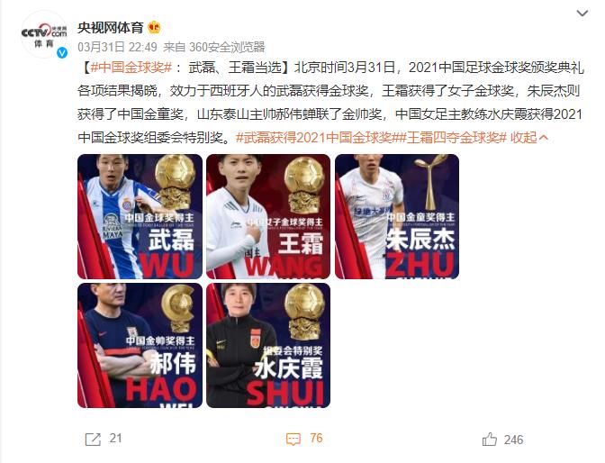 S运动家近日,2021中国金球奖颁奖典礼落下帷幕,各奖项悉数揭晓。武磊时隔一年再次夺得“中国金球奖”,山东泰山主帅郝伟蝉联“中国金帅奖”,朱辰杰荣获“中国金童奖”,王霜第四次捧走了“中国女子金球奖”,杜亮将“中国五人制金球奖”收入囊中,水庆霞获得了“组委会特别奖”。