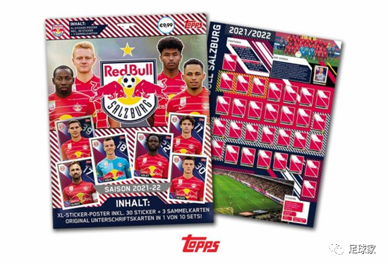 Topps萨尔茨堡红牛队盒的球星贴纸一共有30张(一盒应该就是把这30张不重复的贴纸都包含在内了),其中有部分球员的贴纸是箔卡片(Foil),像当下萨尔茨堡红牛最热门的小妖阿德耶米、沃贝尔、卡马拉、苏契奇等都涵盖在内,萨尔茨堡红牛的队徽贴纸也包含在这30张贴纸之中。