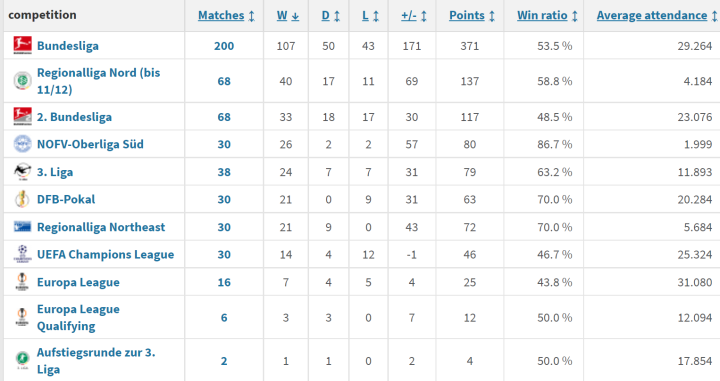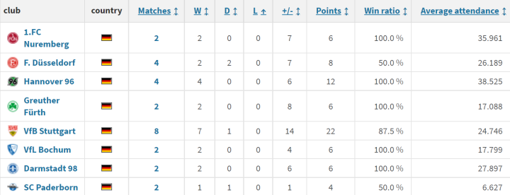 在德甲面对的这26个对手中,莱比锡面对8支球队没有败绩,它们分别是:纽伦堡、杜塞尔多夫、汉诺威96、菲尔特、斯图加特、波鸿、达姆施塔特、帕德博恩。还在面对五支球队时保持全胜战绩:四胜汉诺威,两胜纽伦堡、菲尔特、波鸿、达姆施塔特。