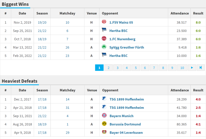 在德甲历史上,莱比锡最大比分的胜利发生在2019年11月2号,当时凭借维尔纳的进球助攻双帽子戏法、波尔森的一射一传、恩昆库的一球两助,莱比锡主场8:0狂胜美因茨。本赛季莱比锡主场对阵柏林赫塔打出6:0,追平第二大比分的胜利。2018-2019赛季主场6:0大胜纽伦堡的比赛中,维尔纳、萨比策均梅开二度,这是莱比锡队史对阵升班马的最大比分胜利,而在本赛季客场对阵菲尔特,球队险些追平这一纪录。莱比锡队史还有5场德甲单场净胜五球,其中三次是面对柏林赫塔。