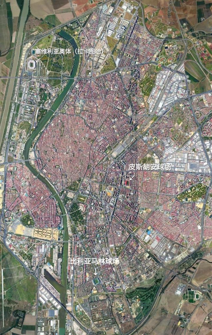 西班牙安达卢西亚自治区首府塞维利亚市的三座著名球场: 图1-3:皮斯胡安球场(塞维利亚)容量42714 图4-6:比利亚马林球场(皇家贝蒂斯)容量60721 图7-8:塞维利亚奥林匹克拉卡图哈体育场(西班牙国家队主场之一,欧足联五星级球场)容量57619(本赛季国王杯决赛场地) 图9:三座球场地理位置(卫星地图)