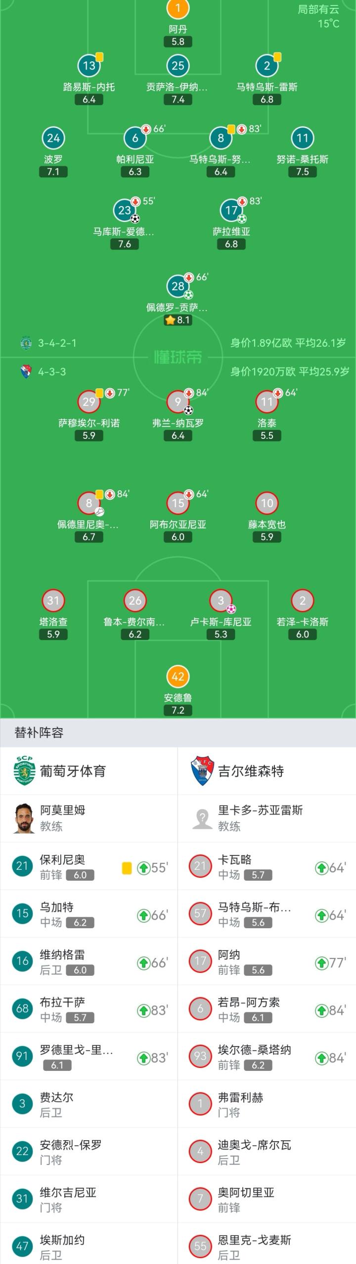 吉尔维森特首发:42-安德鲁、31-塔洛查、26-鲁本-费尔南德斯、3-卢卡斯-库尼亚、2-若泽-卡洛斯、8-佩德里尼奥-莫雷拉(84'6-若昂-阿方索)、15-阿布尔亚尼亚(64'57-马特乌斯-布埃诺)、10-藤本宽也、29-萨穆埃尔-利诺(77'17-阿纳)、9-弗兰-纳瓦罗(84'93-埃尔德-桑塔纳)、11-洛泰(64'21-卡瓦略)