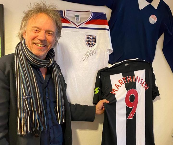 (吕恩·马尔廷森拿着一件由凯文-基冈签名的英格兰球衣和一件他心爱的纽卡斯尔联球衣)