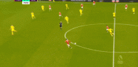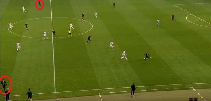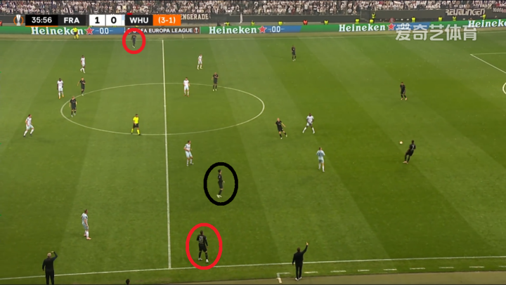 第一,  技术型球员回撤打开路线,因为镰田大地接球的时候,法兰克福的两个翼卫已经全部来到进攻第一线,彻底拉开了进攻宽度,也迫使西汉姆联的左前卫弗尔纳尔斯临时回撤,变成了翼卫:
