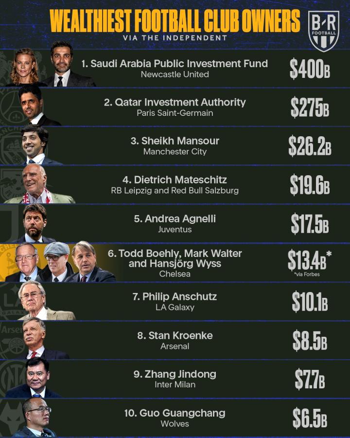 外媒统计足球俱乐部老板身价,切尔西新老板所属财团位列第六