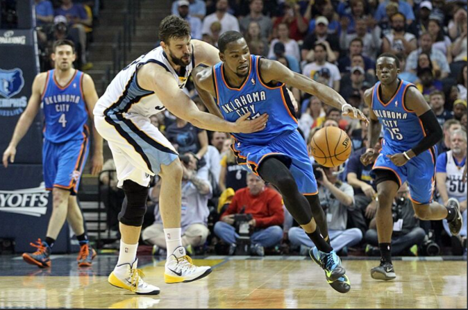 2014年首轮,由该赛季MVP杜兰特领军的雷霆,遭遇灰熊的强力阻击。前4场战罢,双方打成2-2平。天王山之战在俄城进行,雷霆却以99-100加时落败,杜兰特错失决胜三分。