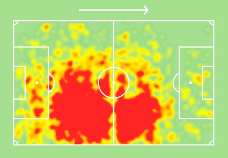 上图是本赛季廷贝尔的球场表现热区图,作为一名右中卫,廷贝尔的跑动能力出众,覆盖范围较大,不仅要拖后进行防守,还要适时的插上参与进攻。