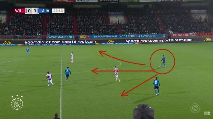 身后存在另有让出位置,拖后防守的球员,被解放出的廷贝尔更可以尽情展现自己在视野、组织方面的天赋。身居右侧中卫的廷贝尔能够送出上图中这种穿透力极强的身后球,依靠这个传球,阿贾克斯迅速推进到了对方的防线,传中后经过中路球员的过渡,后点插上的塔莉亚菲科几乎是打空门得手。