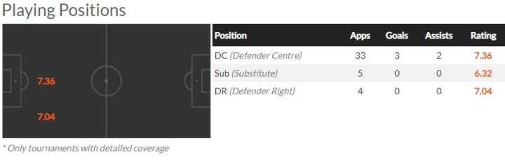而作为滕哈格一手提拔上来的亲兵,廷贝尔也没有辜负前者对他的信任。本赛季,廷贝尔一共在各项赛事中为阿贾克斯出战43场(其中首发40次,图中数据和懂球帝有出入,以我懂为准),几乎打满了阿贾克斯的所有比赛,并且在中后卫位置上场均能够拿出7.36的评分,能力可见一斑。