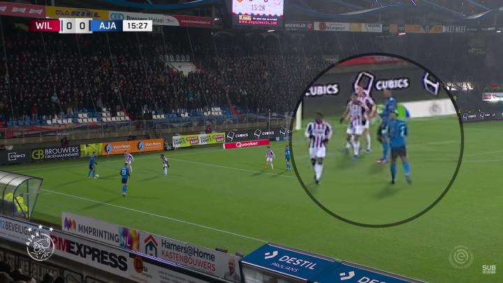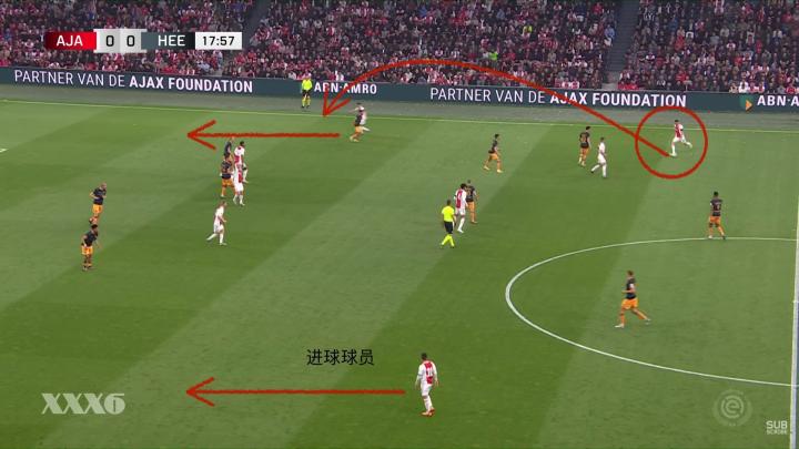 在这次阿贾克斯战术角球开出后前场的进攻配合中,由于后腰暂时作为球队的中卫拖在了球队整体阵型的最后,廷贝尔适时插上深入禁区,在前场的进攻中为球队形成了充足的人数优势。