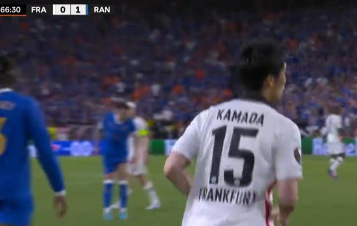 比赛进行到第67分钟时,镰田大地在前场拼抢,迫使对方失误,罗德前场断球立刻送出挑传,镰田大地插入禁区(并没有越位)获得单刀机会,可惜他的挑射稍稍高出门梁。没能进球,镰田大地跪地捂脸,非常懊恼。