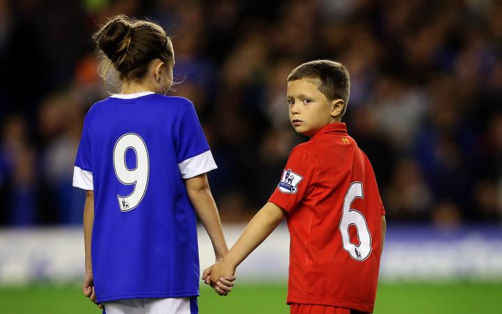 在埃弗顿和利物浦之间的默西塞德郡德比赛前,以及对希尔斯堡惨案致敬期间,两个小球童穿着代表俱乐部颜色的球衣手牵着手走到了球场的中央。2012年9月17日。摄影师:Lee Smith