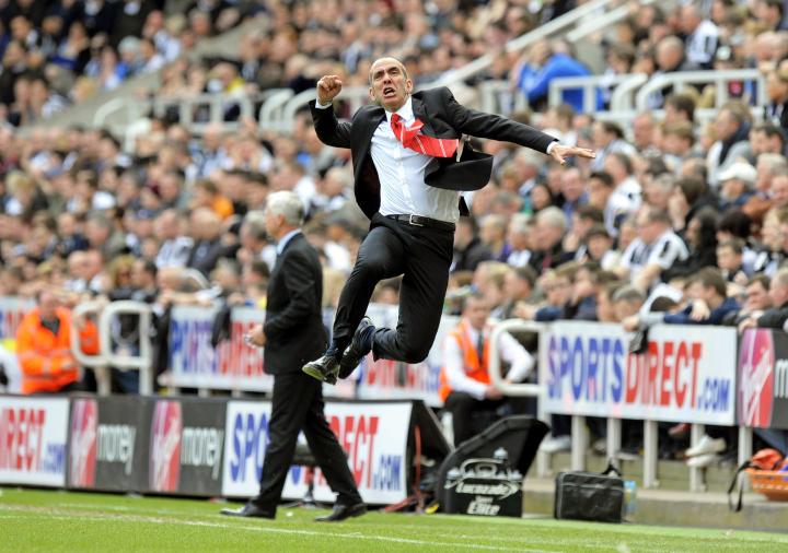 桑德兰主教练保罗·迪卡尼奥庆祝他的球队在对阵纽卡斯尔的比赛中的第一个进球。2013年4月14日。摄影师:Richard Lee