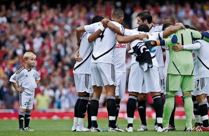 斯旺西的球童对他没有被邀请进球队赛前的围圈打气感到十分不满。2011年9月10日。摄影师:Tom Jenkins