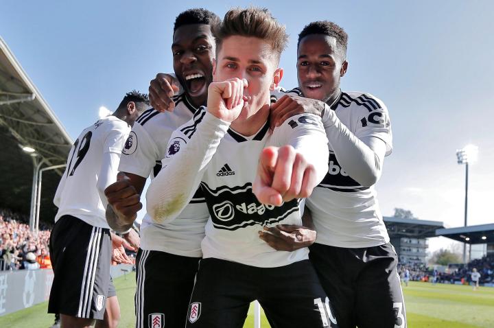富勒姆的汤姆·凯尼(Tom Cairney)与队友蒂莫西·福苏-门萨(Timothy Fosu-Mensah)和瑞恩·塞塞尼翁(Ryan Sessegnon)在主场对阵埃弗顿的比赛中庆祝进球。2019年4月13日。摄影师:Michael Zemanek
