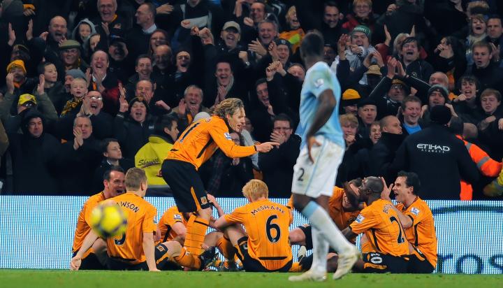 赫尔城的吉米·布拉德(Jimmy Bullard)射入对阵曼城的点球后,模仿主教练菲尔·布朗(Phil Brown)的半场球队谈话的场景。2009年11月28日。摄影师:Andrew Yates