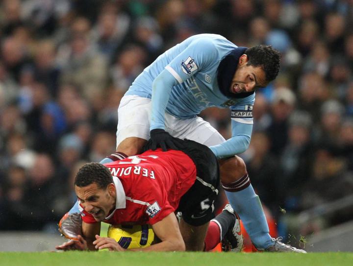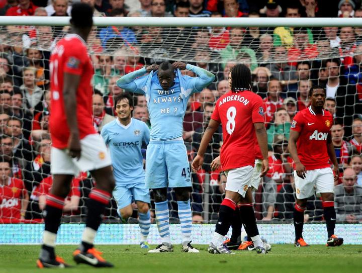 马里奥·巴洛特利(Mario Balotelli)在曼彻斯特德比中打入第一个进球,并掀起球衣展示那句经典的“Why always me?”。2011年10月23日。摄影师:Lee Smith