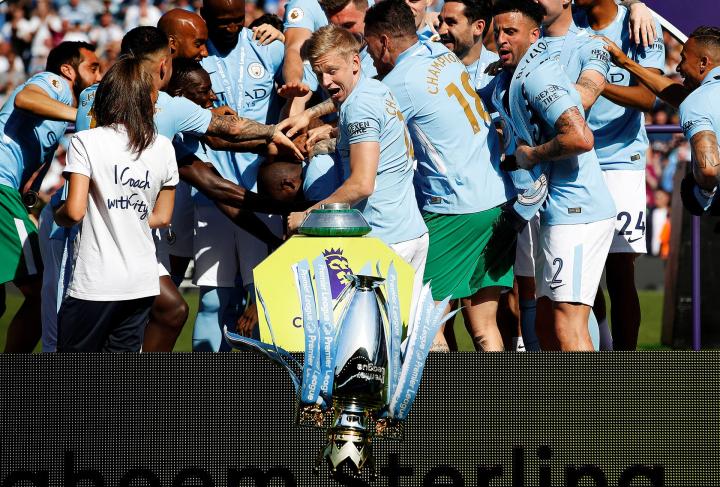 曼城的津琴科在颁奖前离英超奖杯太近了,不小心把它撞到了草地上。2018年5月6日。摄影师:Carl Recine