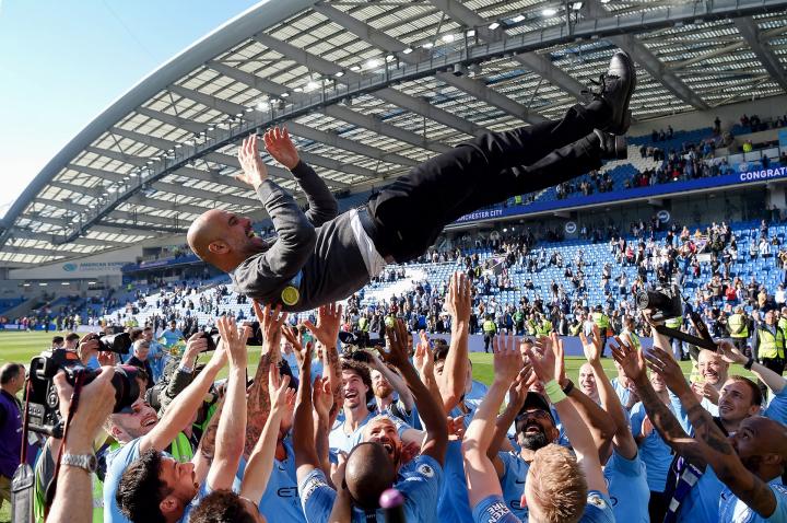 瓜迪奥拉庆祝赢得英超联赛。2019年5月12日。摄影师:Mike Hewitt