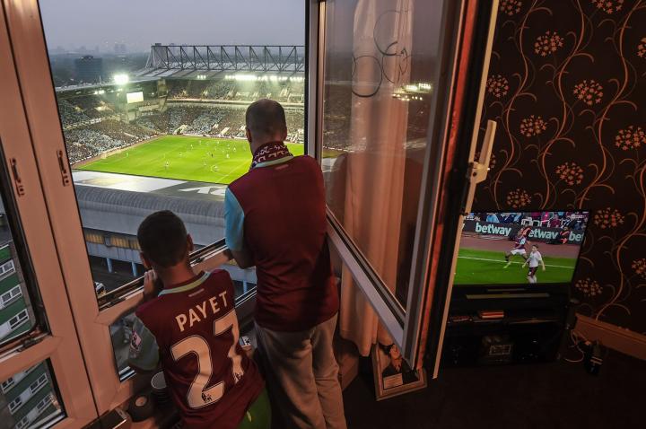一位年轻的球迷和他的父亲在窗外观看西汉姆在伦敦厄普顿公园的最后一场比赛。2016年5月10日。摄影师:Michael Regan