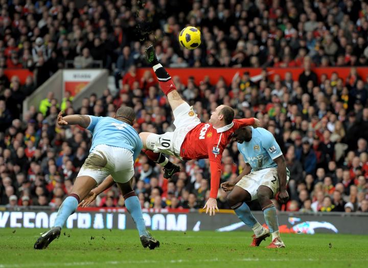 韦恩·鲁尼在老特拉福德对阵曼城的比赛中倒钩破门。2011年2月12日。摄影师:Andrew Yates