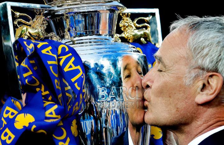 莱斯特城主帅克劳迪奥·拉涅利在为俱乐部带来童话般的冠军头衔后,亲吻了巴克莱英超联赛冠军奖杯。2016年5月7日。摄影师:Carl Recine