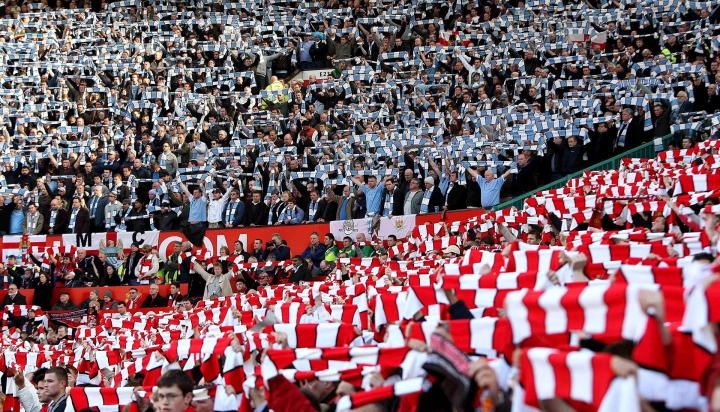 曼联和曼城球迷在老特拉福德为慕尼黑空难遇难者默哀一分钟。2008年2月10日。摄影师:Martin Rickett