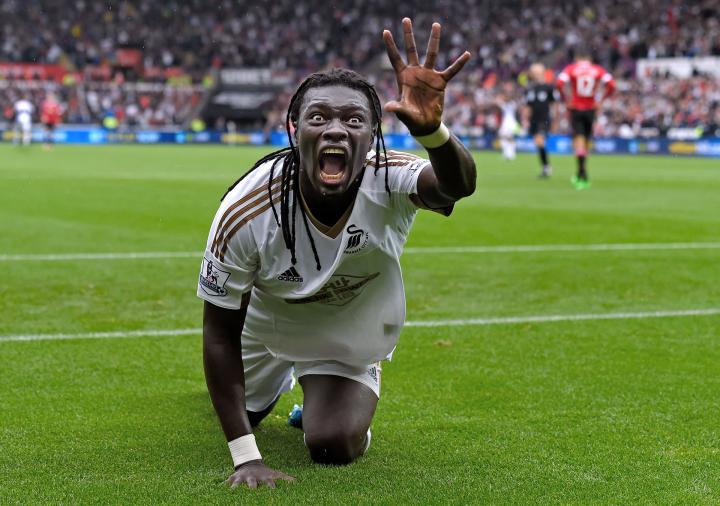 斯旺西的巴菲廷比·戈米斯(Bafétimbi Gomis)在对阵曼联的比赛中打进第二球后,以“黑豹爬行”的方式庆祝。2015年8月30日。摄影师:Stu Forster