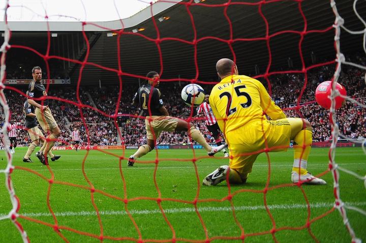 桑德兰的达伦·本特(Darren Bent)的射门打中了用一个被利物浦球迷扔到球场上的沙滩球后折射进网。2009年10月17日。摄影师:Mike Hewitt