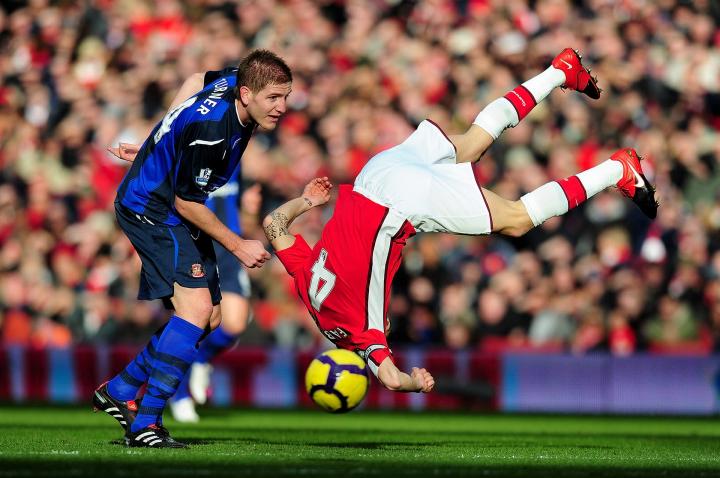 法布雷加斯在阿森纳和桑德兰的比赛中被掀翻。2010年9月20日。摄影师:Mike Hewitt